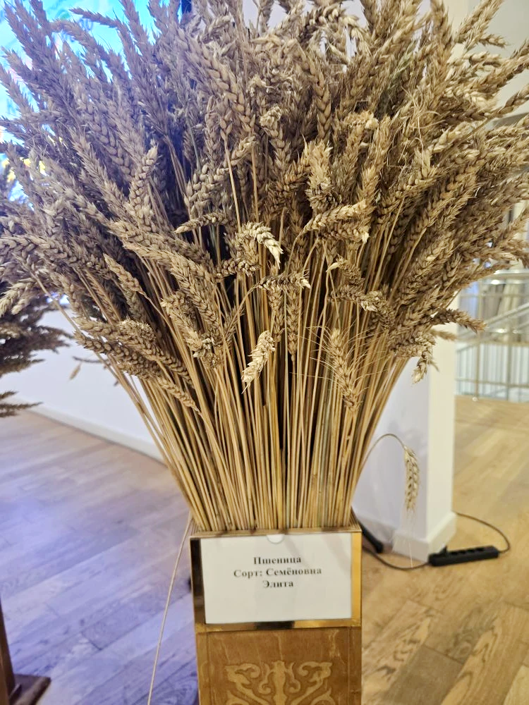 На фото: Аким Северо-Казахстанской области Гауез Нурмухамбетов и директор Омского АНЦ Максим Чекусов в ходе посещения экспозиции; сорта яровой мягкой пшеницы селекции Омского АНЦ на выставке в Петропавловске – Уралосибирская и Семёновна (совместный сорт с селекционерами Казахстана); доклад директора Омского АНЦ