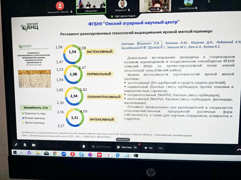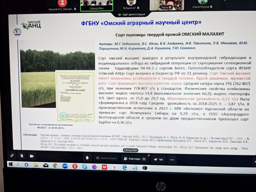В докладе директора КрасНИИСХ ФИЦ КНЦ СО РАН, кандидата с.-х. наук Алексея Липшина отмечены разработки Омского аграрного научного центра, к примеру, регламент разноуровневых технологий выращивания яровой мягкой пшеницы. В перечне сортов, созданных сибирскими учеными, особое внимание уделено качественным характеристикам яровой твердой пшеницы Омский малахит и посевного гороха Бонус 2 селекции Омского АНЦ.