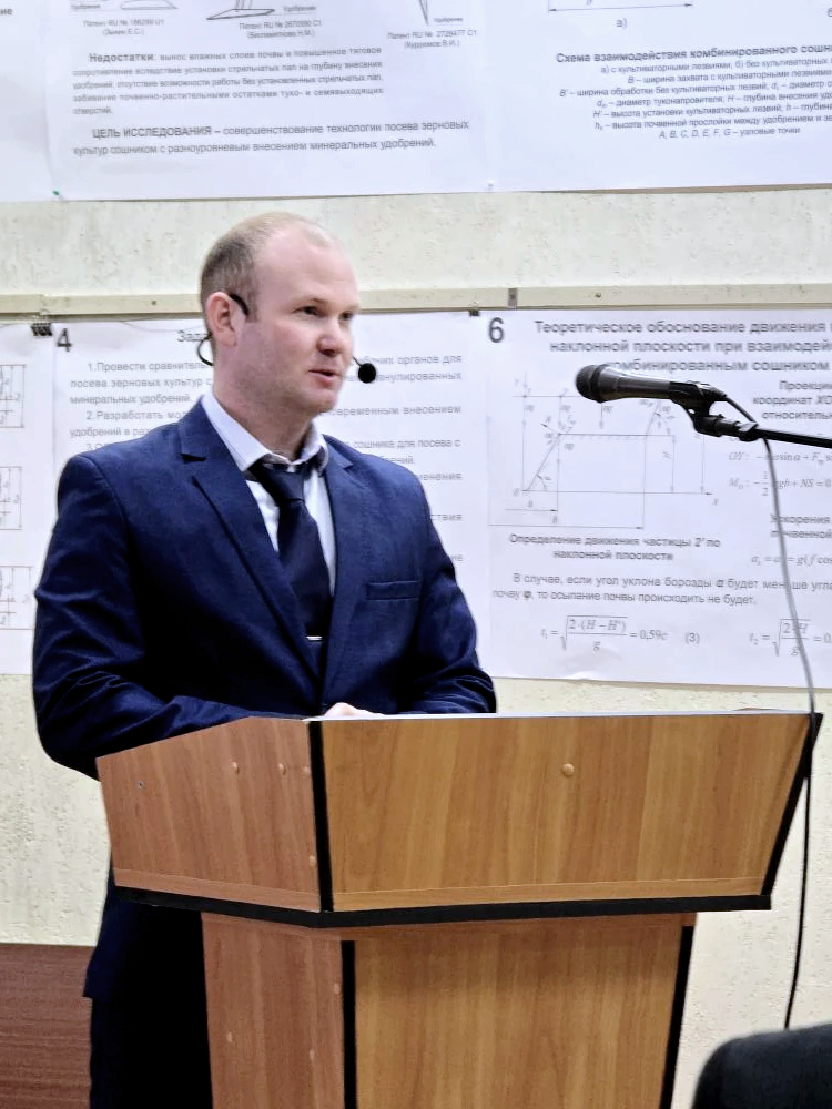 Тема кандидатской диссертации: «Комбинированный сошник для разноуровневого посева зерновых культур и внесения минеральных удобрений». Работа выполнена под руководством кандидата технических наук Максима Чекусова.